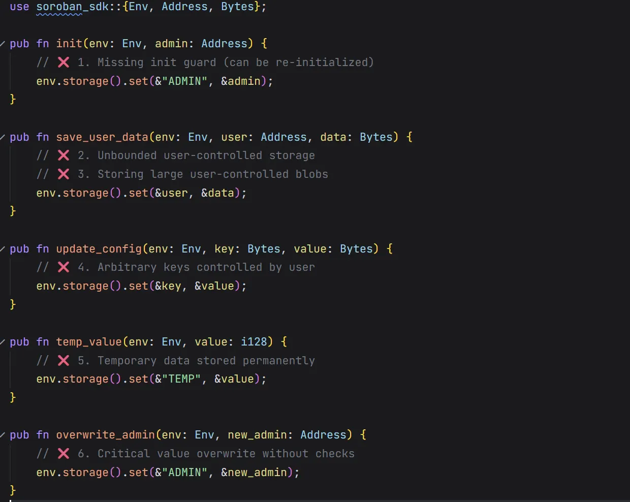 Below is a single Soroban-style contract that intentionally demonstrates the most common storage bugs developers ship on the Stellar network: