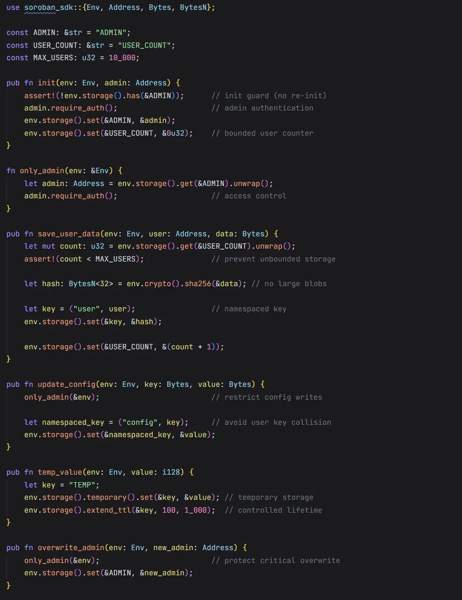 In Soroban on the Stellar network, storage is a key–value store with rent and TTL, not free or implicitly permanent. Every write costs resources, and data can expire unless its TTL is explicitly extended. Contracts choose between persistent storage (long-lived, more expensive) and temporary storage (short-lived, auto-expiring). Because keys and values are fully controlled by contract code, mistakes like unbounded writes, user-supplied keys, or missing init guards can permanently bloat state, overwrite critical values, or make future calls fail. In practice, storage needs bounds, namespacing, access control, and explicit TTL management.