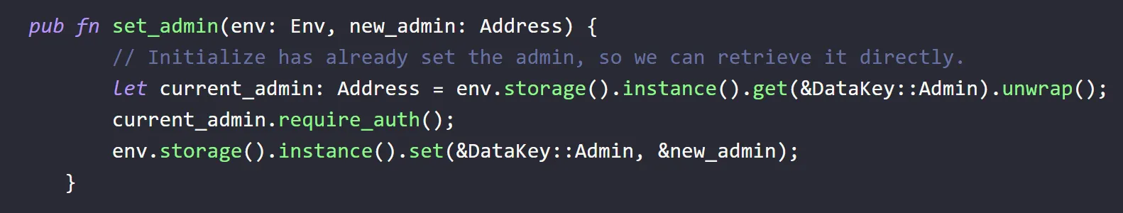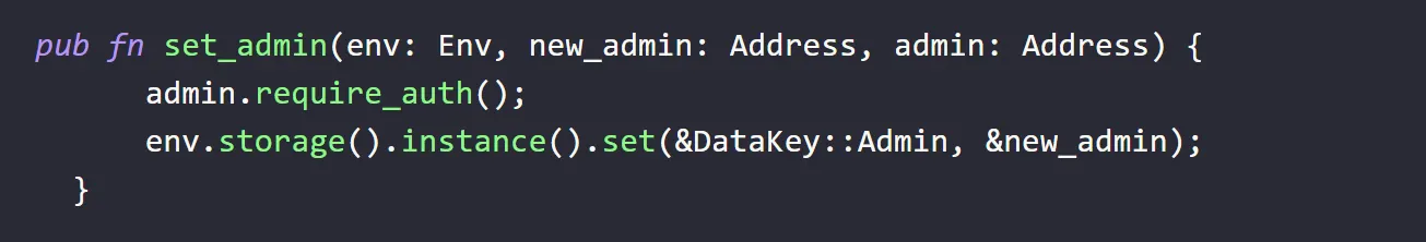 So basically the problem with this is - it checks require_auth() for the admin parameter passed in set_admin function by any user. So the attacker could pass valid admin address, and it will be validated from the user input instead of the user's actual address.